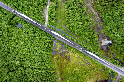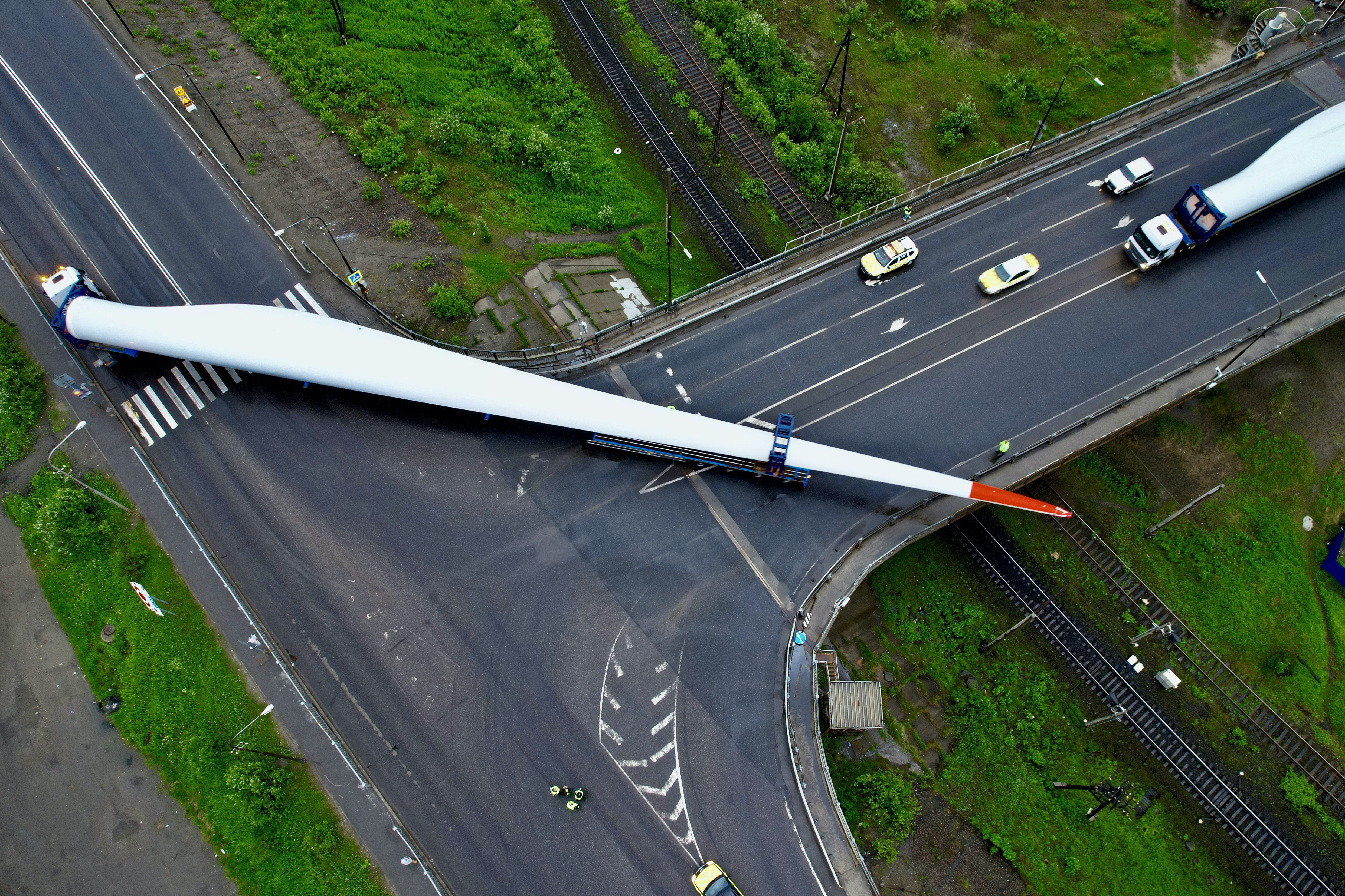 На этот раз автопоезд содержал в себе трал-лопастевоз. Таким образом мы смогли бережно перевезти лопасти, массой в 20.927 кг и длиной в 65 метров каждая. Для рассчета и визуализации сложных мест этой перевозки мы использовали возможности современного CGI и 3D-моделирования, а также расчеты в специальном програмном обеспечении на основе данных замеров “на земле” и полученных с помощью съемки с дронов.